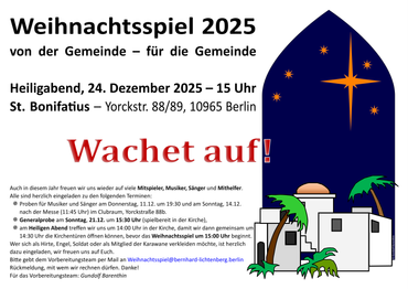 Wer sich als Hirte, Engel, Soldat oder als Mitglied der Karawane verkleiden möchte, ist herzlich dazu eingeladen, wir freuen uns darauf. Bitte gebt dem Vorbereitungsteam per Mail an weihnachtsspiel@bernhard-lichtenberg.berlin Rückmeldung, mit wem wir rechnen können. Danke!