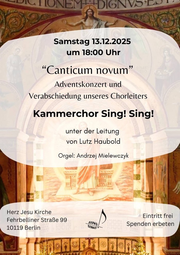 Am 13.12.2025 um 18:00 Uhr dürfen wir den Kammerchor Sing! Sing! in der Kirche Herz Jesu begrüßen. Seien Sie herzlich eingeladen zum Adventskonzert "Canticum Novum" - der Eintritt ist frei, Spenden sind willkommen.