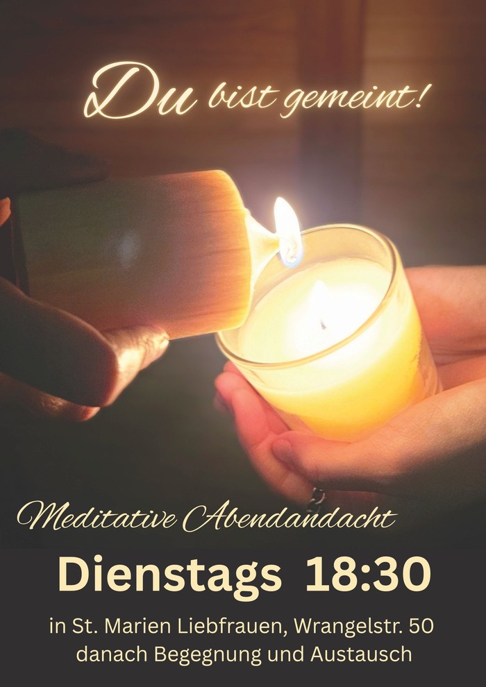 Jeden Dienstag um 18:30 Uhr sind Sie herzlich eingeladen, sich angesprochen zu fühlen: Am 14. April 2026 startet die neue thematische Reihe “Du bist gemeint!“ Es gibt wie üblich leise Lieder, einen Moment der Stille und ein Ritual. Wer mag, ist zum anschließenden Austausch eingeladen...