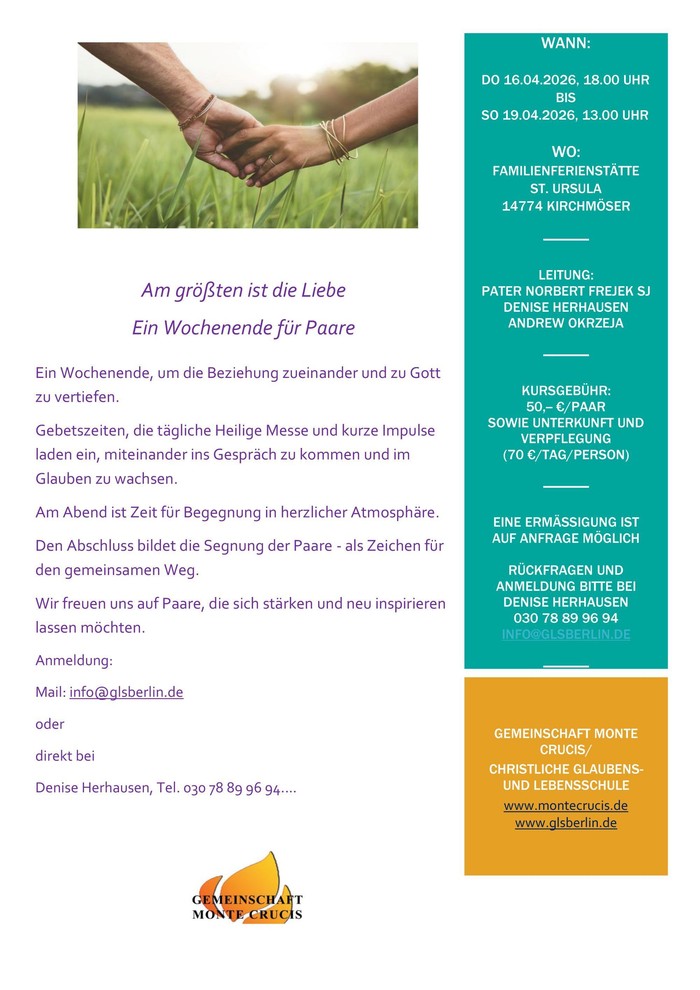 Unter dem Motto „Am größten ist die Liebe“ sind Paare vom 16.-19. April 2026 in die Familienferienstätte St. Ursula, Kirchmöser bei Brandenburg eingeladen: