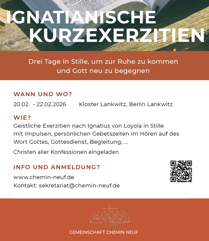 In der Fastenzeit lädt die Gemeinschaft Chemin Neuf vom 20. bis zum 22. Februar 2026 zu drei Tagen in Stille in das Kloster Lankwitz ein. Die Kurzexerzitien bieten die Möglichkeit, in die ignatianische Spiritualität einzusteigen, Christus besser kennenzulernen und seine Barmherzigkeit zu erfahren.