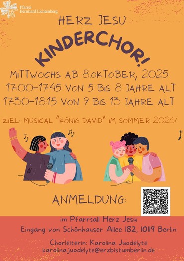 Neben Auftritten in unseren Gottesdiensten haben wir ein besonderes Highlight vor: Im Juni 2026 führen wir gemeinsam mit dem Kinderchor der Pfarrei Theresia von Avila das Musical „König David“ auf! Anmeldung durch den QR-Code im Flyer oder auf der Internetseite: