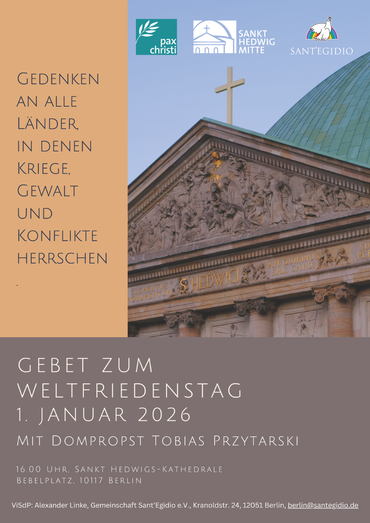 Am 1. Januar 2026 wird es um 16:00 Uhr in der St.-Hedwigs-Kathedrale wieder ein ökumenisches Friedensgebet geben. Pax christi Berlin und Sant’Egidio laden anlässlich des Weltfriedenstages zu einem ökumenischen Friedensgebet ein.