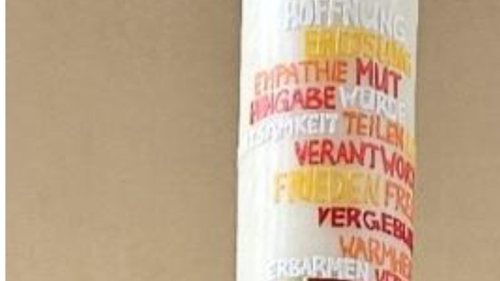 Sich wandeln und sich verwandeln lassen bleibt eine tägliche Herausforderung, aber eine, die sich lohnt. Vom Bösen zum Guten, von Krankheit zum Heilsein, vom Tod zum Leben. Auf der Kerze rechts sind in sehr hellen Farben Begriffe zu finden, die Freude und Hoffnung machen: Liebe, Leben, Mut, Versöhnung, Hingabe, Toleranz... Eine schöne Vorstellung, wenn aus Unterdrückung Gleichberechtigung, aus Missbrauch Verantwortung, aus Krieg dauerhafter Frieden würde. Die Auferstehungsbotschaft macht Verwandlung möglich.