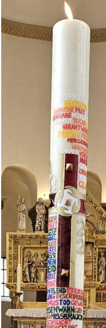 Die Osterkerze ist voll mit Wörtern, die einem sofort ins Auge springen. Viele Begriffe, mühsam aus Wachsplatten mit einer Nadel ausgekratzt… Die linke Seite des Kreuzes steht für den Tod und für das Erlösungsbedürftige. Hätte ich mich auf die klassischen Wurzelsünden wie Neid, Gier, Habsucht, Wut, Wollust, Völlerei und Hochmut beschränkt, würde man vermutlich nicht weiter nachdenken. Gerade deshalb braucht es die Ergänzungen um die Konsequenzen dieser Sünden, bewusst in dunkleren Farben geschrieben, sowohl physischer als auch psychischer Art. Eigenschaften und Taten, die kaputt machen, zerstören, zum Verzweifeln bringen, wie Eifersucht, Maßlosigkeit, Größenwahn, Missbrauch, Hass, Krieg, Femizide, Ausbeutung… die Liste ließe sich er-weitern. Schnell ist man hineingenommen in das aktuelle Zeitgeschehen, politisch, gesellschaftlich und kirchlich, findet Bezüge zu Herrschenden wie Trump, Putin, Xi Ping, Orbán, Netanjahu und terroristischen Gruppen und deren Anführern, Parteien und unseren Kirchen.