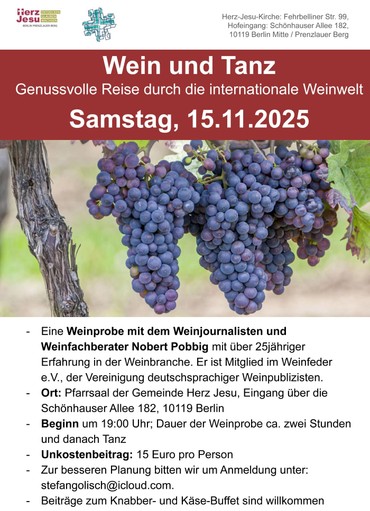 „Der Wein erfreut des Menschen Herz“, so steht es in der Bibel. Und darum lädt die Gemeinde Herz Jesu alle Pfarreimitglieder und Gäste am Samstag, den 15. November 2025 zum Weinfest mit Tanz in den Pfarrsaal nach Herz Jesu ein.