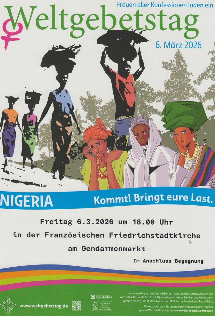 Der Ökumenische Weltgebetstag – veranstaltet von Frauen aus Kreuzberg und Mitte – wird am kommenden Freitag, den 6. März 2026 um 18:00 Uhr in der Evangelischen Friedrichstadtkirche am Gendarmenmarkt gefeiert. Zum ökumenischen Gottesdienst sind alle eingeladen. Anschließend ist noch Gelegenheit zur Begegnung mit einem kleinen nigerianischen Imbiss.